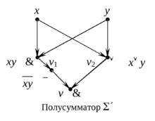 Пример. Полусумматор. Пусть v и v1 — выходы на рисунке,