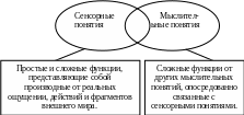 Можно считать, что, как правило, мыслительные понятия представляют собой сложные производные от более простых понятий, используемых в процессах сенсорного анализа. Другими словами, мы определяем некоторое мыслительное понятие через длинную последовательность других понятий, приводящую рано или поздно либо к сенсорным, либо к моторным (двигательным) признакам. Для иллюстрации можно привести простейший случай определения понятия «ускорение» через такие понятия, как «скорость» и «время», причем во втором цикле процедуры формулирования определения понятия скорости, естественно, выводятся через понятия пути и времени, которые и являются в наших рассуждениях измеряемыми, сенсорными параметрами.