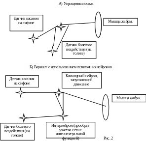Упрощенная схема участка нейронной сети, реализующей такое поведение, приведена на рис. 2. На рис. 2, А представлен вариант, при котором ассоциативное обучение реализуется на уровне контактов нейронов трех типов: нейрона — датчика касаний сифона (1), нейрона — датчика болевого воздействия (3) и нейрона, запускающего двигательный акт сжатия мышцы мантии (2). На рис. 17, Б рассмотрен более сложный вариант, при котором в схему включен дополнительный элемент — интернейрон (4), играющий роль прообраза участка нейронной сети, обладающего некоторой интеллектуальной функцией. Группы интернейронов или вставочных нейронов, т.е. нейронов, вставленных между сенсорными и двигательными нейронами, действительно становятся все более и более сильно развитыми по мере продвижения животных по филогенетической лестнице.