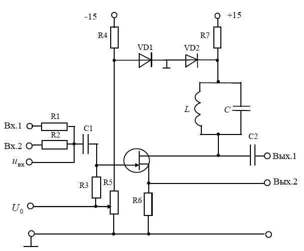 Усилитель выполнен на полевом транзисторе. Транзистор можно рассматривать как нелинейный резистивный элемент (нелинейное сопротивление). Проходная ВАХ транзистора определяет зависимость между выходным током транзистора и входным напряжением.