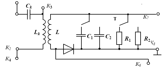 Радиосигнал от генератора АМ поступает на последовательный колебательный контур LkCk . Несущую частоту радиосигнала устанавливают равной резонансной частоте контура. Это позволяет увеличить амплитуду напряжения, подаваемого на детектор.