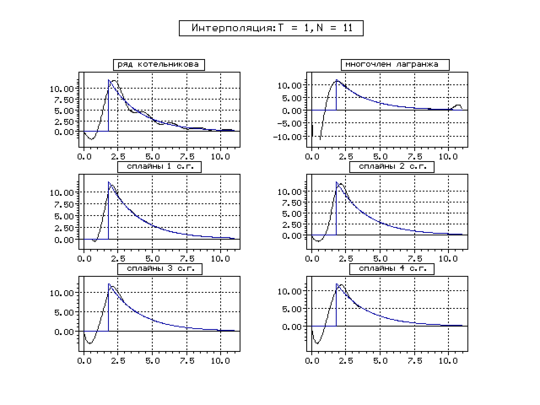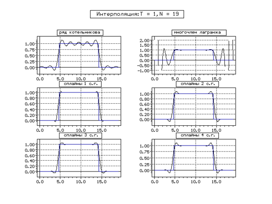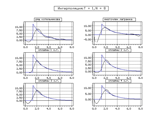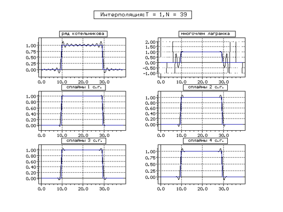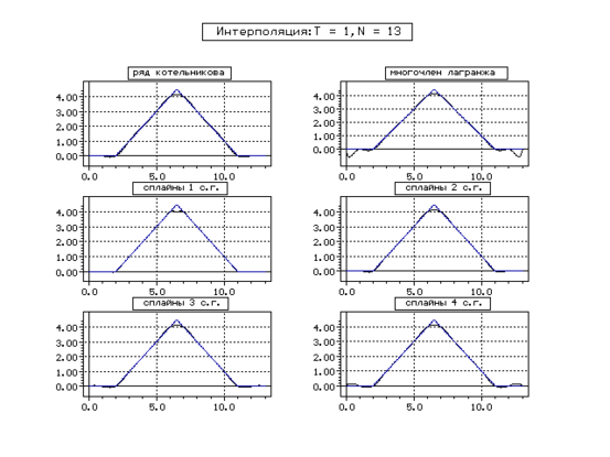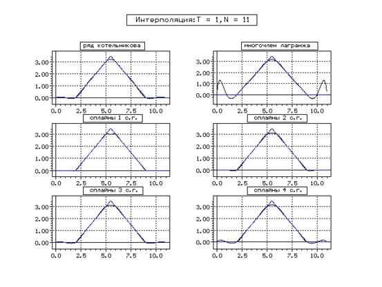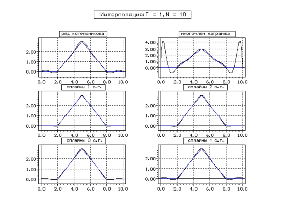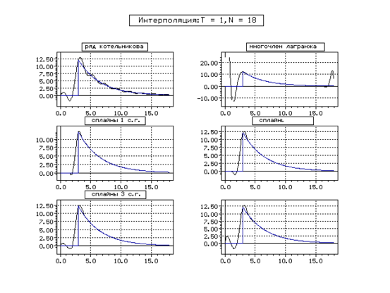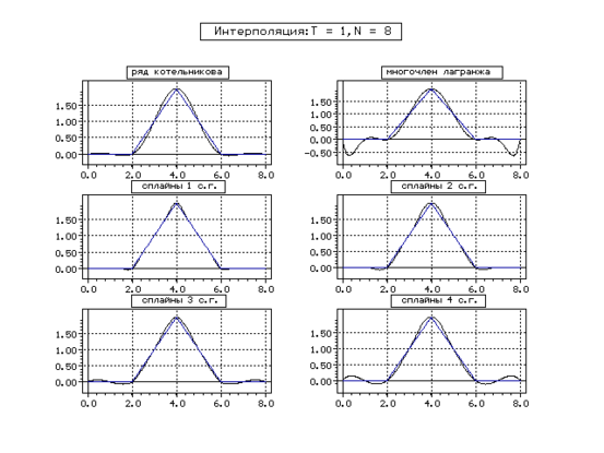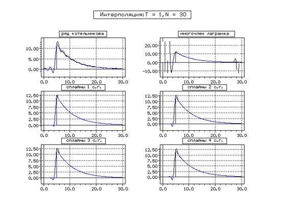 | Метод | Котельникова | Сплайн 1 с. г. | Сплайн 2 с. г. | Сплайн 3 с. г. | Сплайн 4 с. г. | ||||||||||