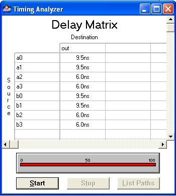 Рассчитаем временные задержки от каждого входа до каждого логически связанного с ним выхода с помощью приложения Timing Analyzer: