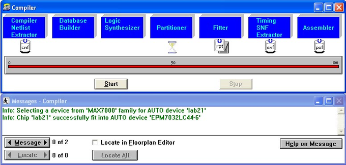 Далее проводим проверку введенной схемы. Для этого нажимаем пиктограмму Save & Check. При отсутствии ошибок ввода проекта, его можно компилировать. Открываем окно компилятора и нажимаем кнопку START. Если не был назначен тип ПЛИС для компиляции проекта то система сама назначает подходящий тип микросхемы, и оповещает пользователя в окне Messages – Compiler.