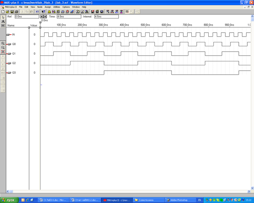 Открываем Waveform Editor, добавляем входные и выходные сигналы. Задаем входной периодический сигнал (IN). Сохраняем файл и запускаем симулятор. Результатом симуляции будет диаграммы работы счетчика: