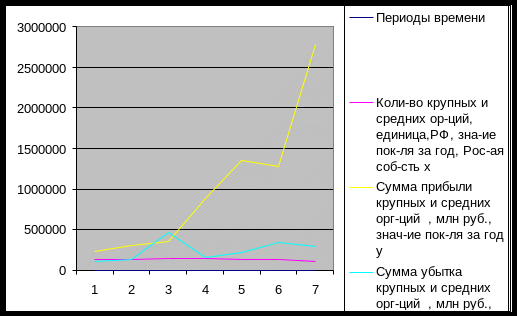 На основе графического анализа можно сделать вывод о том, что сумма прибыли крупных и средних организаций резко растут вплоть до 2004 года, а убытки крупных и средних организаций и число крупных и средних организаций постепенно падают, который на прямую зависит от прибыли и убытков организации.