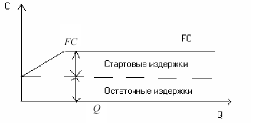 Постоянные издержки могут быть разделены на две группы: стартовые и остаточные (рис. 1). К остаточным относится та часть постоянных издержек, которые продолжает нести предприятие, несмотря на то, что производство и реализация на какое-то время полностью остановлены. К стартовым издержкам относится та часть постоянных издержек, которые возникают с возобновлением производства и реализации.