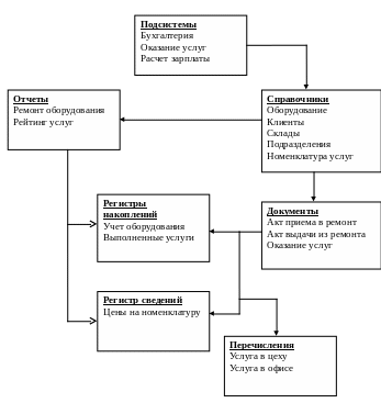 Создание объектов и настройка взаимосвязей между ними производится визуальными средствами. Ниже приводится общая схема данного прикладного решения (конфигурации) (рис.1).
