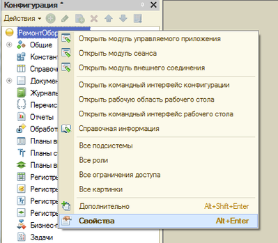 Дадим конфигурации Имя. На корне Конфигурации (корень дерева конфигурации) щелкаем левой кнопкой мыши. Появляется контекстное меню (рис. 8), выбираем Свойства и задаем название Конфигурации «Ремонт оборудования » (рис. 9).