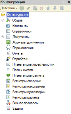 После запуска Конфигуратора и создания новой информационной базы нужно открыть дерево конфигурации при помощи кнопки на панели инструментов