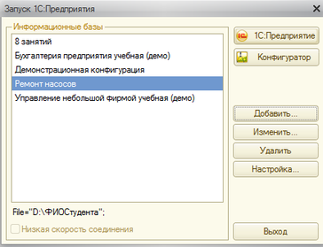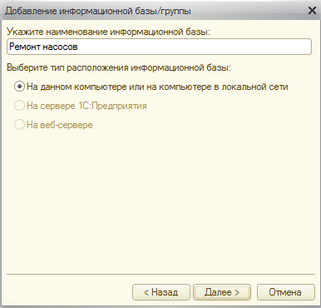 В поле Укажите наименование информационной базы назовите имя новой базы Ремонт насосов (рис. 4а).