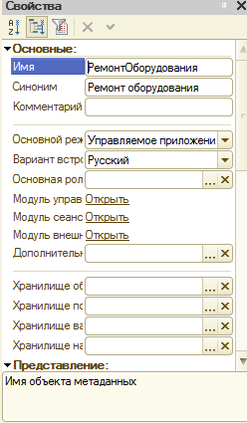Автоматически сформировался синоним названия конфигурации Ремонт оборудования, который будет показан в заголовке основного окна в пользовательском режиме.