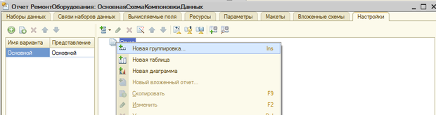 Рис. 32а. Фрагмент схемы компоновки данных Отчета. Вкладка Настройки. Создание новой группировки