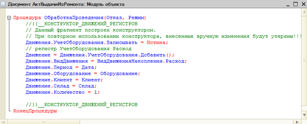 Конструктор создал обработчик события ОбработкаПроведения объекта конфигурации Документ Акт приема в ремонт, поместил его в модуль объекта и открыл текст модуля.