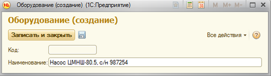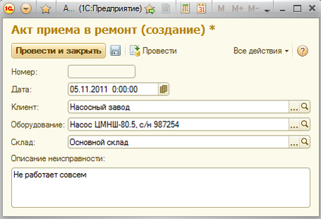 3. В список Актов приема в ремонт добавим новый документ: Клиент – Насосный завод. Оборудование – Насос ЦМНШ-80.5, с/н 987254. Склад – Основной склад (он уже есть в конфигурации, потому что при разработке был обозначен как предопределенный). Неисправность – Не работает совсем. Дата – 5.11.2011 г. Провести. Закрыть (рис. 35в).