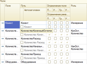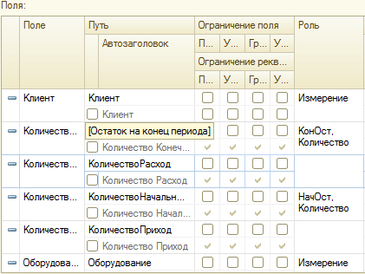 Причем Движение.Оборудование, Движение.Клиент, Движение.Склад – это измерения регистра, Движение.Количество – это ресурс регистра, а Движение.ВидДвижения и Движение.Период – стандартные реквизиты регистра, которые создаются автоматически.