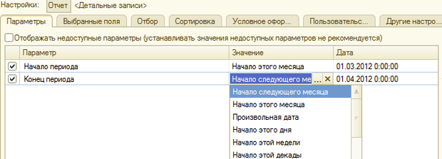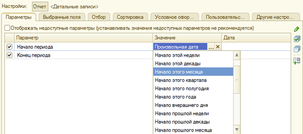 Рис. 33а. Фрагмент схемы компоновки данных Отчета. Вкладка Параметры. Начало периода