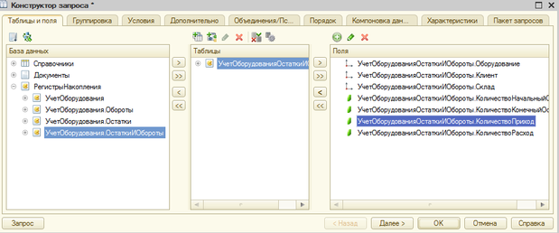 Раскроем Регистры накопления. Перенесем ОстаткиИОборы в Таблицы. Из этой Таблице возьмем все Поля, кроме поля Оборот (рис. 28а).