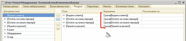 Рис. 31. Фрагмент схемы компоновки данных Отчета. Вкладка Ресурсы