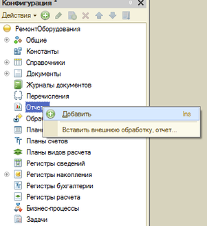 Для того, чтобы добавить отчет, в Дереве конфигурации выберите Отчет Добавить (рис. 25).