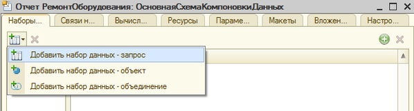 Любая схема компоновки данных должна знать, откуда необходимо брать данные для отчета. Поэтому добавим Набор данных – запрос (рис. 27).