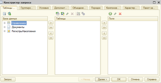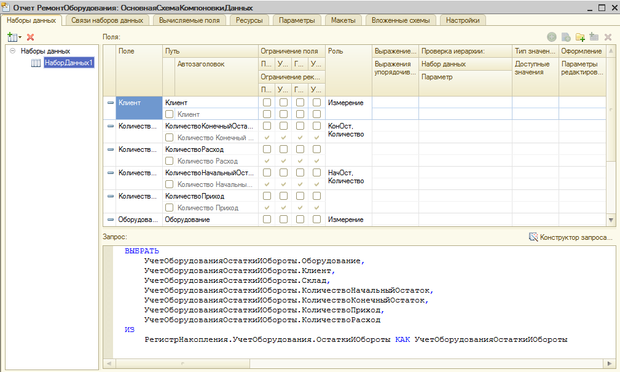 8. Такой набор данных получает данные из базы данных 1С: Предприятия с помощью запроса. Какие именно данные получать, описывается на языке запросов. Нажмем кнопку Конструктор запроса