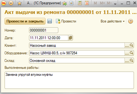 4. Далее откроем список Актов выдачи из ремонта. Отметим, что 11.11.2011 г. насос был отремонтирован и отдан клиенту. Выполненные работы – Замена упругой втулки муфты. Провести. Закрыть (рис. 36).