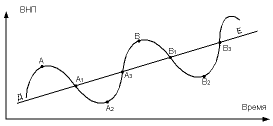 Рис. 2. Цикл в изображении К.Макконнелла и С.Брю: АВ – первый цикл. Внутри него фазы: А – пик, АА1 – спад, А1А2 – депрессия. А2 – нижняя точка спада, А2А3 – оживление, А3В – подъем. Тенденция общего роста: ДЕ