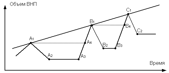 А1В1 – первый цикл. Внутри него фазы: А1А1 – кризис, А2А2 –депрессия, А3А4 – оживление, А4В1 – подъем. В1С1 – второй цикл.