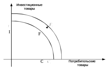 Правостороннее смещение производственной функции от F к F1 показывает расширение производственных возможностей экономики страны, т. е. границ потенциального ВВП, что говорит о наличии экономического роста. В результате одновременно увеличивается и количество инвестиционных товаров (I®I1), и потребительских товаров (С®С1) при любых альтернативных издержках;