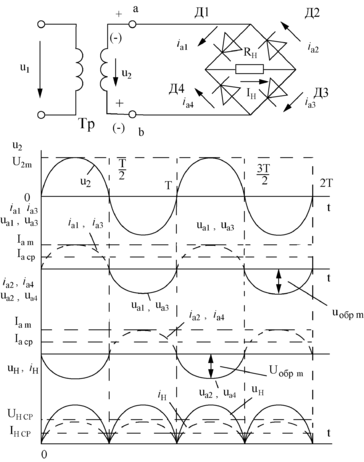 Работа выпрямителя рассматривается с помощью временных диаграмм.
