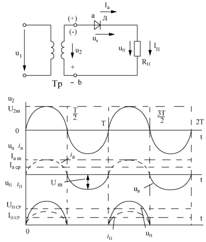 Анализ работы выпрямителей проводят при допущениях, что диод (вентиль) и трансформатор идеальны. Это означает, что