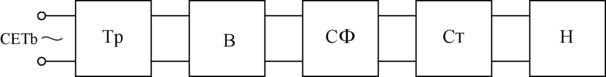 Структурная схема выпрямительного устройства показана на рис.2.30. В нее входит: Тр - трансформатор, изменяющий величину получаемого от сети переменного напряжения в соответствии с необходимой величиной напряжения на выходе выпрямителя; В – выпрямитель, содержащий один или несколько вентилей (диодов); СФ – сглаживающий фильтр, уменьшающий пульсации выпрямленного напряжения; Ст - стабилизатор, поддерживающий постоянное напряжение на нагрузочном устройстве; Н – нагрузочное устройство (например, нагрузочный резистор).