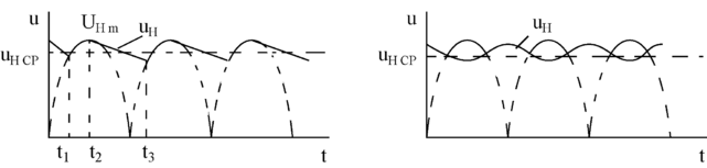 (период времени t1 – t2 рис.2.34а), а затем разряжается через резистор RН (период времени t2 – t3 рис. 2.34а). Если постоянна времени разряда конденсатора = Сф RН значительно превышает период времени Т изменения uН, то напряжение на конденсаторе при разряде уменьшается несущественно за время (t2 – t3 ). Это приводит к значительному увеличению среднего значения напряжения на нагрузочном резисторе U