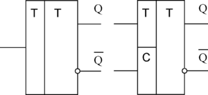 Т-триггер – триггер с счётным Т-входом. Характерным свойством Т-триггера является его переключение в противоположное состояние с приходом каждого очередного входного импульса. В виду его широкого применения в счётчиках импульсов его часто называют триггером со счётным запуском. Обычно он выполняется на базе R-S триггеров. Его условное обозначение приведено на рисунке 3.29а. Т-триггер может выполняться синхронным (рисунок 3.29б). В этом случае он имеет дополнительный вход С, на который подаются синхронизирующие импульсы.