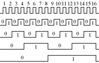 В процессе работы двоичного счётчика частота следования импульсов на выходе каждого последующего триггера уменьшается вдвое по сравнению с частотой его входных импульсов (смотри рисунок 3.32). Это свойство схемы используют для построения делителей частоты.