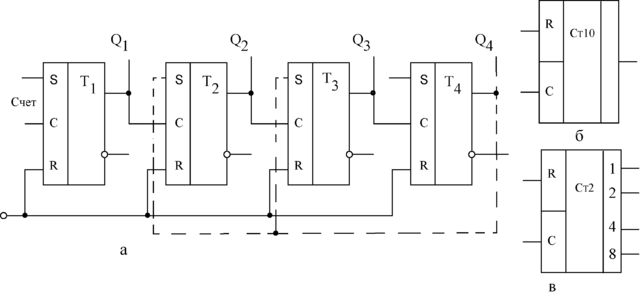 | Рис. 3.31. Схема четырехразрядного счетчика - а; условное обозначение десятичного - б и двоичного - в счетчиков |