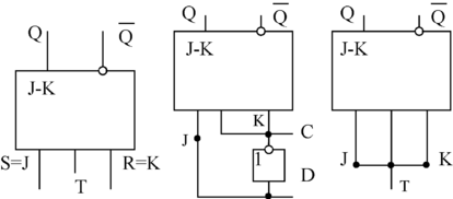 J-K триггер получают на основе Т-триггеров. Они имеют дополнительные входы J и K. Наличие двух дополнительных входов расширяет функциональные возможности триггеров, в связи с чем J-K триггеры называют универсальными. При соответствующем включении J и K входов триггера могут быть получены R-S, D и T-триггеры. При этом R-S, D-T – триггеры получаются тактируемыми. R-S триггер (рисунок 30а) получают подачей на вход J сигнала S, а на вход K сигнала R. D-триггер создают (рисунок 3.30б) введением инвертора между входами J и K. Т-триггер (рисунок 3.30в) реализуют подключением J и K входов к входу Т.