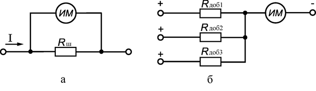 Для расширения пределов измерения значений напряжения последовательно с измерительным механизмом включают добавочные резисторы