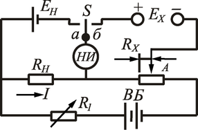 — измеряемая ЭДС; НИ — нуль-индикатор (обычно магнитоэлектрический гальванометр);