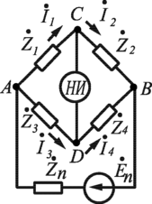 ,— комплексные сопротивления плеч моста. Если ток индикатора НИ равен нулю - подобный режим называется режимом равновесия моста, топотенциалы точек