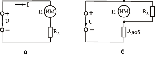 Омметры. Непосредственно и быстро сопротивления элементов цепи постоянного тока можно измерить при помощи омметра. В схемах, представленных на рис. 16 ИМ — магнитоэлектрический измерительный механизм.