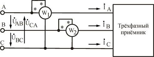 . На рис. 4.12 представлена одна из трёх возможных схем включения двух приборов для измерения активной мощности. Метод двух ваттметров применяется для измерения активной мощности в несимметричных трехпроводных трехфазных цепях.