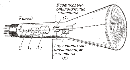 формирует узкий электронный луч. Под действием электронов, падающих на экран, покрытый слоем люминофора, последний светится и на экране наблюдается светящаяся точка. Подавая на отклоняющие пластины напряжение, можно управлять положением луча. На горизонтально отклоняющие пластины