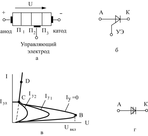 Тиристоры имеют два вывода от крайних чередующихся p- и n- областей и управляющий электрод (рис. 1.18,а).