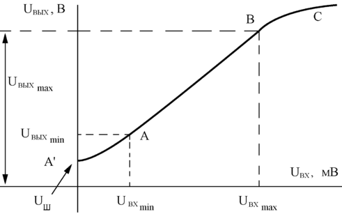 Амплитудная характеристика усилителя (рис. 2.3) имеет несколько участков: участок АА/, обусловленный внутренними шумами усилителями и помехами; прямолинейный участок А-В – рабочий участок характеристики; и участок ВС, обусловленный нелинейностью усилительных элементов при большом уровне сигнала.