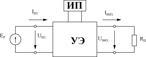 Любой усилитель имеет структуру (рис. 2.1.): входную и выходную цепи, к которым подключается источник сигнала ЕГ и нагрузочное устройство RH, источник питания – ИП и усилительный элемент – УЭ (транзистор, микросхема). Процесс усиления связан с преобразованием энергии источника питания в энергию выходного сигнала Uвых усилителя.