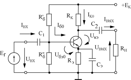 Однако включение резистора Rэ уменьшает Кu усилителя, т. к. часть полезного (усиливаемого сигнала) uвх выделяется на нем и не усиливается транзистором (уравнение для входной цепи усилителя по переменному току запишется uбэ=uвх-Rэiэ). Чтобы этого избежать резистор RЭ шунтируется конденсатором СЭ, емкость которого выбирается таким образом, чтобы для всех частот усиливаемого переменного сигнала его сопротивление было много меньше RЭ, тогда переменная составляющего тока эмиттера проходит через конденсатор СЭ, почти не вызывая падения напряжения на резисторе RЭ. В результате падение напряжения на резисторе RЭ от постоянной составляющей тока практически не меняется, а, следовательно, переменное напряжение на входе каскада оказывается равным переменному напряжению между базой и эмиттером uвхuбэ, т.е. усиливаемое напряжение не меняется за счет цепочки RэСэ (стабильно при изменении температуры).
