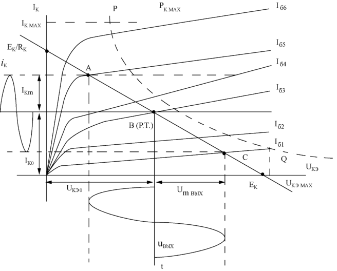 В режиме покоя (Uвх = 0) положение рабочей точки выбирается в середине рабочей области характеристик, ограниченной гиперболой PQ допустимой мощности, рассеиваемой транзистором, а также максимально допустимыми током Iк МАХ и напряжением транзистора Uкэ max (рис. 2.8а).