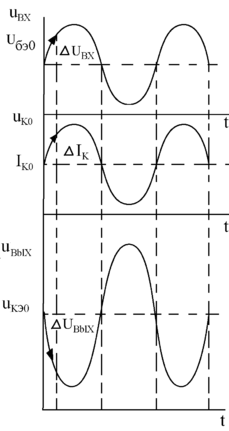 (это хорошо иллюстрирует временная диаграмма работы усилителя (рис.2.7)). Следует заметить, что усилитель меняет фазу сигнала на 1800 (см. рис. 2.7), это означает, что УОЭ является инвертирующим.